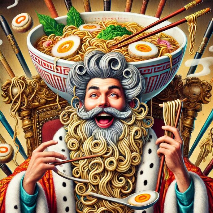 タカシが振り向くと、そこには異常に大きなラーメンの髪型をした、堂々たる姿のラーメン王が現れた。ラーメン王は長い髭を手で撫でながら、タカシに向かって言った。