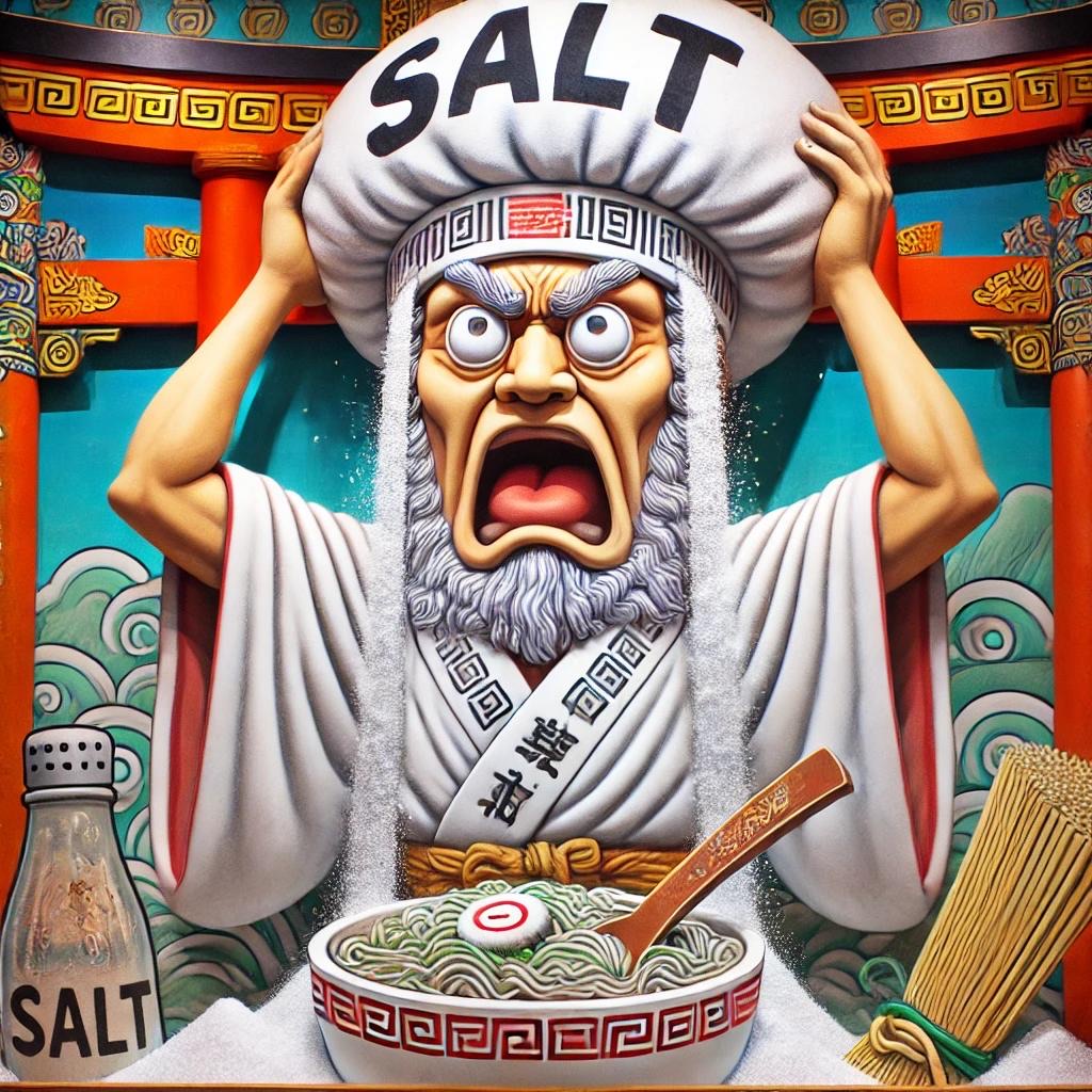 まず現れたのは、「塩ラーメンの神」こと、シオカミ。彼は頭に大きな塩の袋を背負い、白い衣装を着ているが、その顔は何故かしょっぱそうに見える。「シオカミ様だ!」と周囲の住民が叫ぶ中、シオカミは足元の塩をまき散らしながら、威厳を持って宣言した。