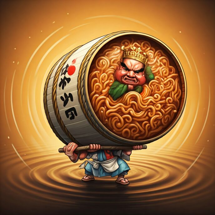 次に登場したのは、「味噌ラーメンの帝王」こと、ミソダルマ。彼は巨大な味噌の樽を引きずりながら現れ、その重さで周囲が揺れるほどだった。ミソダルマは大きな声で言った。
