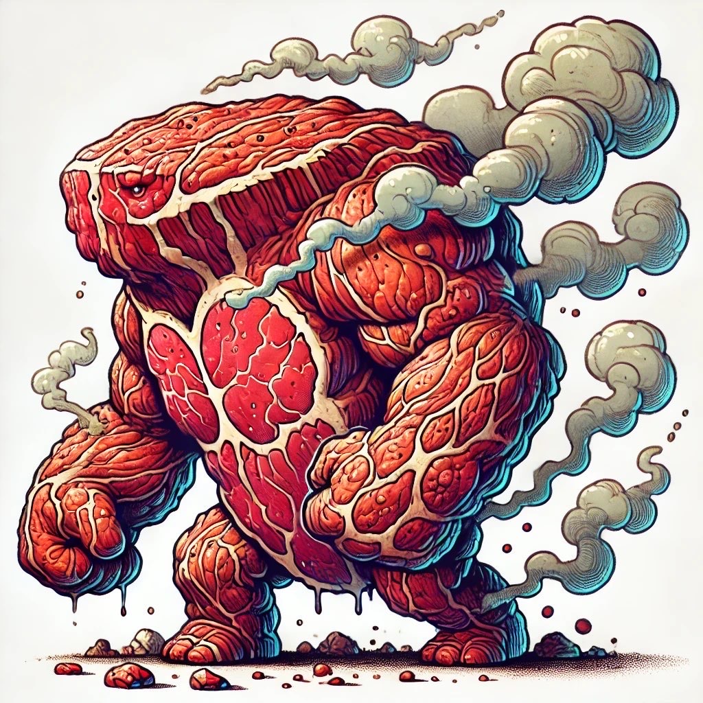 その時、肉の塊が動き出し、まるで生きているかのように巨大な肉の獣が姿を現した!その獣はまるで筋肉の塊のようにゴツゴツしており、全身が焼け焦げたような香ばしい匂いを放っている。