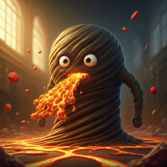 「カレー忍者の必殺技…『スプーン・オブ・デス!』」クマ吉は声を震わせながら叫んだ。スプーンから放たれる光は、まるでカレーの神々が降臨したかのように輝き、カレーマグマを見事に反射させて跳ね返した。