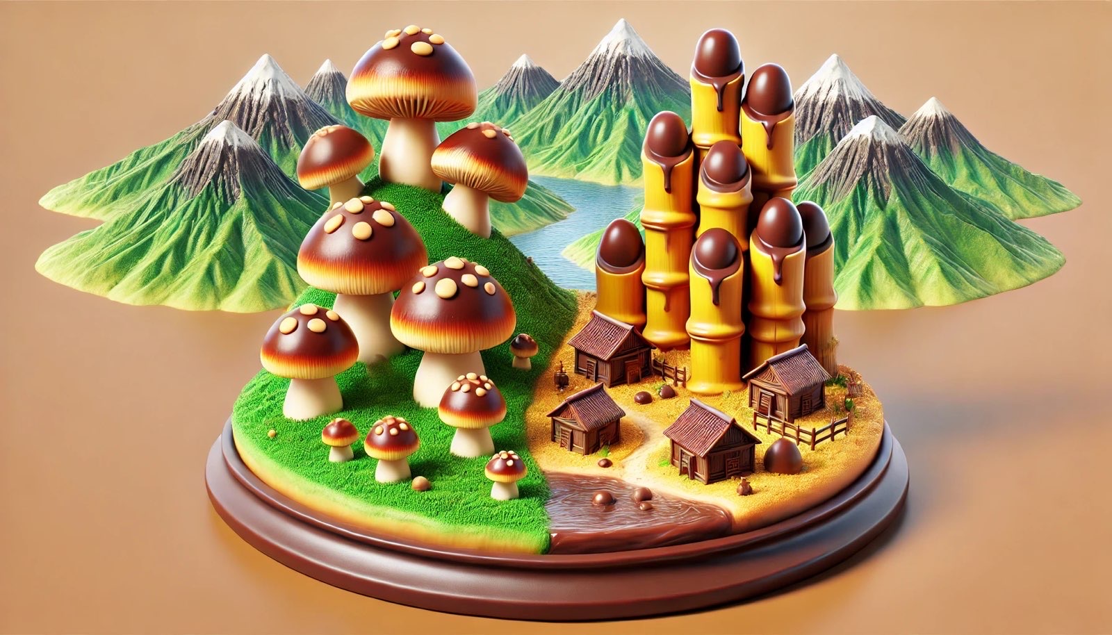 「聞いたことがある。キノコ山とタケノコ里、両者は長年にわたり、お菓子の世界で激しく争っているんだ。」クマ吉は深刻な顔で言った。「そしてその争いの中心には、なんとチョコレートが関わっている。」