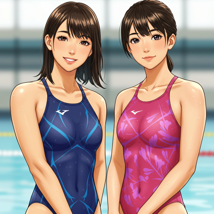 「競泳用水着ってすごく泳ぎやすいね。」博美が満足そうに言うと、彩が頷いた。「うん、いい選択だったよね。次はタイム測ってみようよ!」