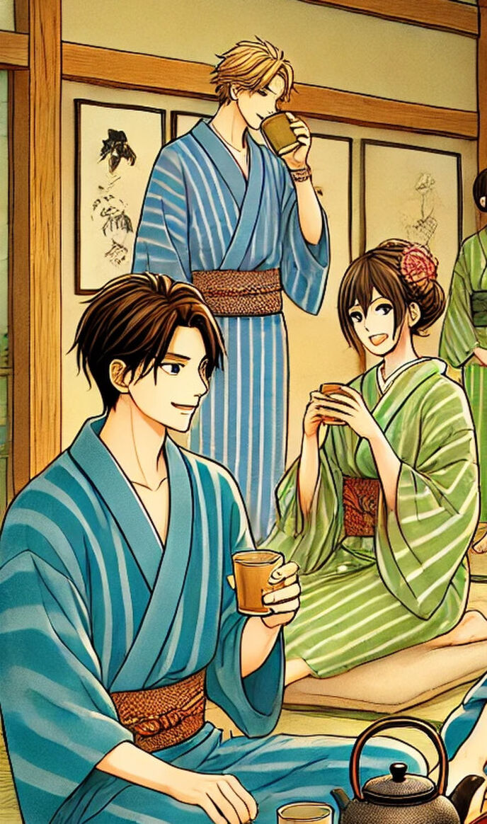 友人たちはそれぞれリラックスムードで、荷物を置いてすぐに浴衣に着替え始めた。直人は少し戸惑いながらも、紗栄子の体に合わせて可愛らしい浴衣を選んでみたが、合わせる帯の位置や浴衣の着方が意外と複雑で、友人に教わりながらなんとか着こなした。