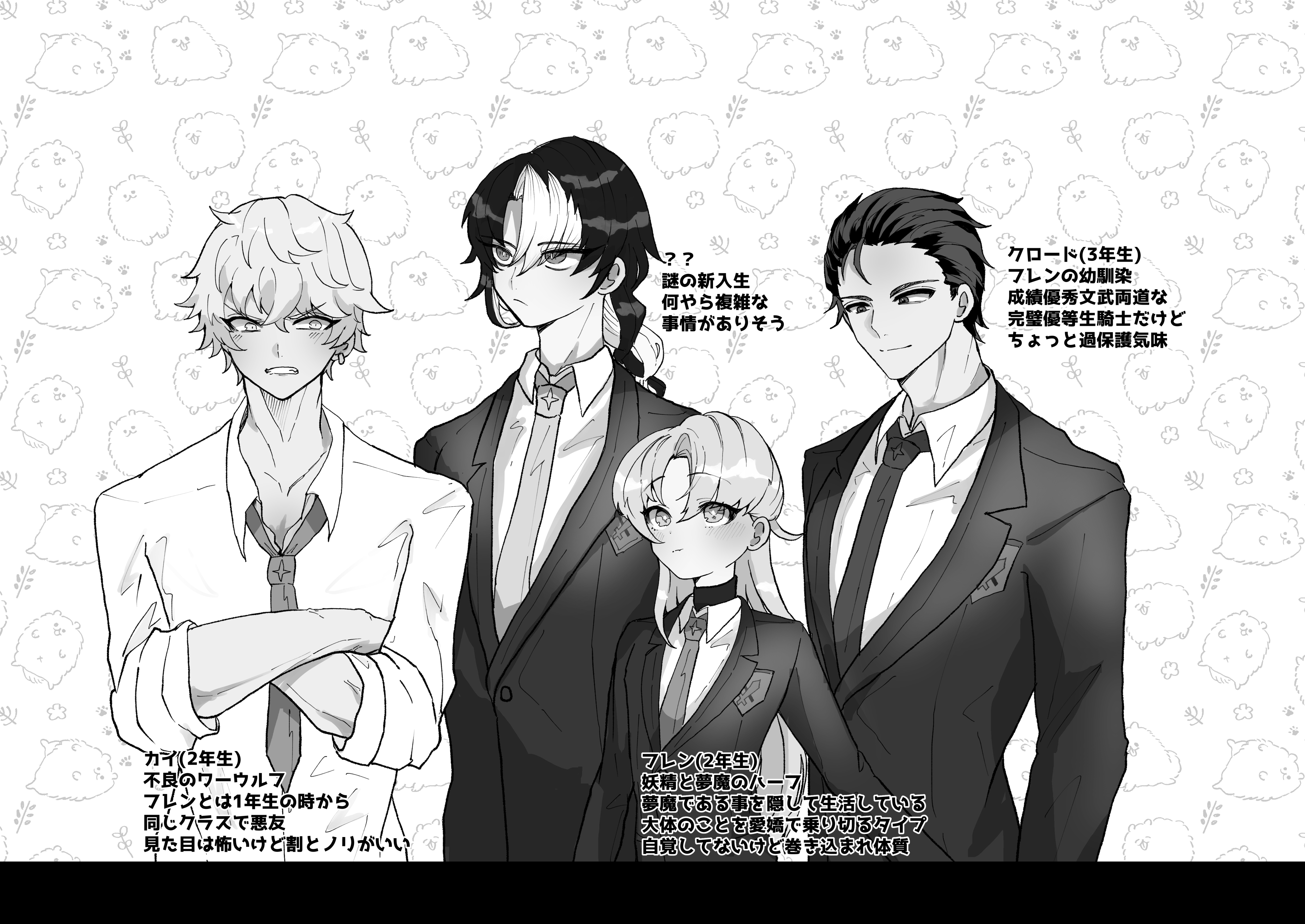 カイは典型的な不良だ。今日び不良なんて逆に古いと思うけどポリシーだなんだって言って貫いてるらしい。その素行に加え、ワーウルフらしい威圧感のある体格と狼の様な鋭い金眼が特徴の顔つきもあって周囲からは結構怖がられてる。