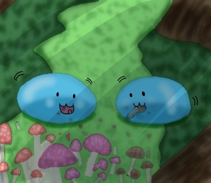 森の中でも比較的開けた場所に出ると、草木の緑色の中では保護色っぽいんだが微妙に目立つ、一抱えはある大きさの丸っこい水色の塊が二つ、プルプルと微動しているのが見えた。