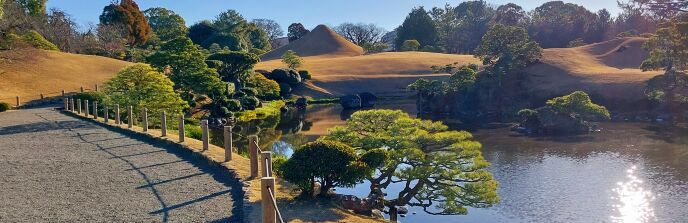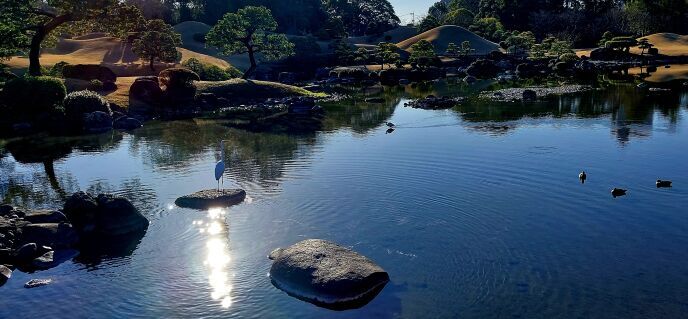 東海道五十三次をイメージして作られた庭園だそうですが……朝から庭師の方々が仕事をしていました。
