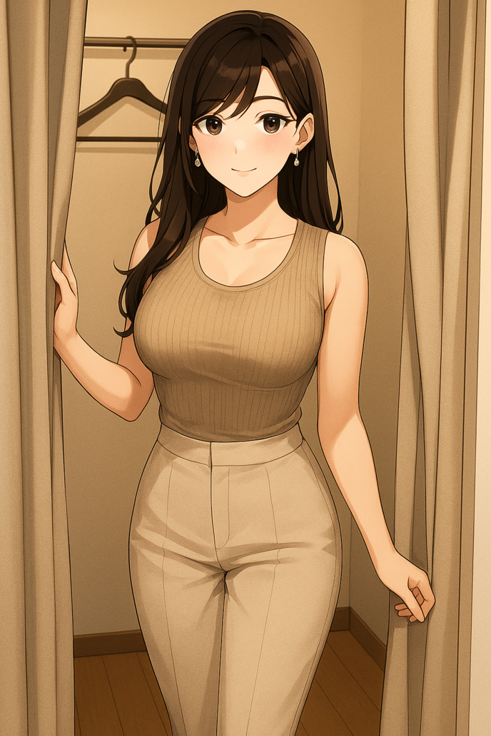 試着を終えて出てきた沙耶香さんは、淡いベージュのパンツにノースリーブのトップス。