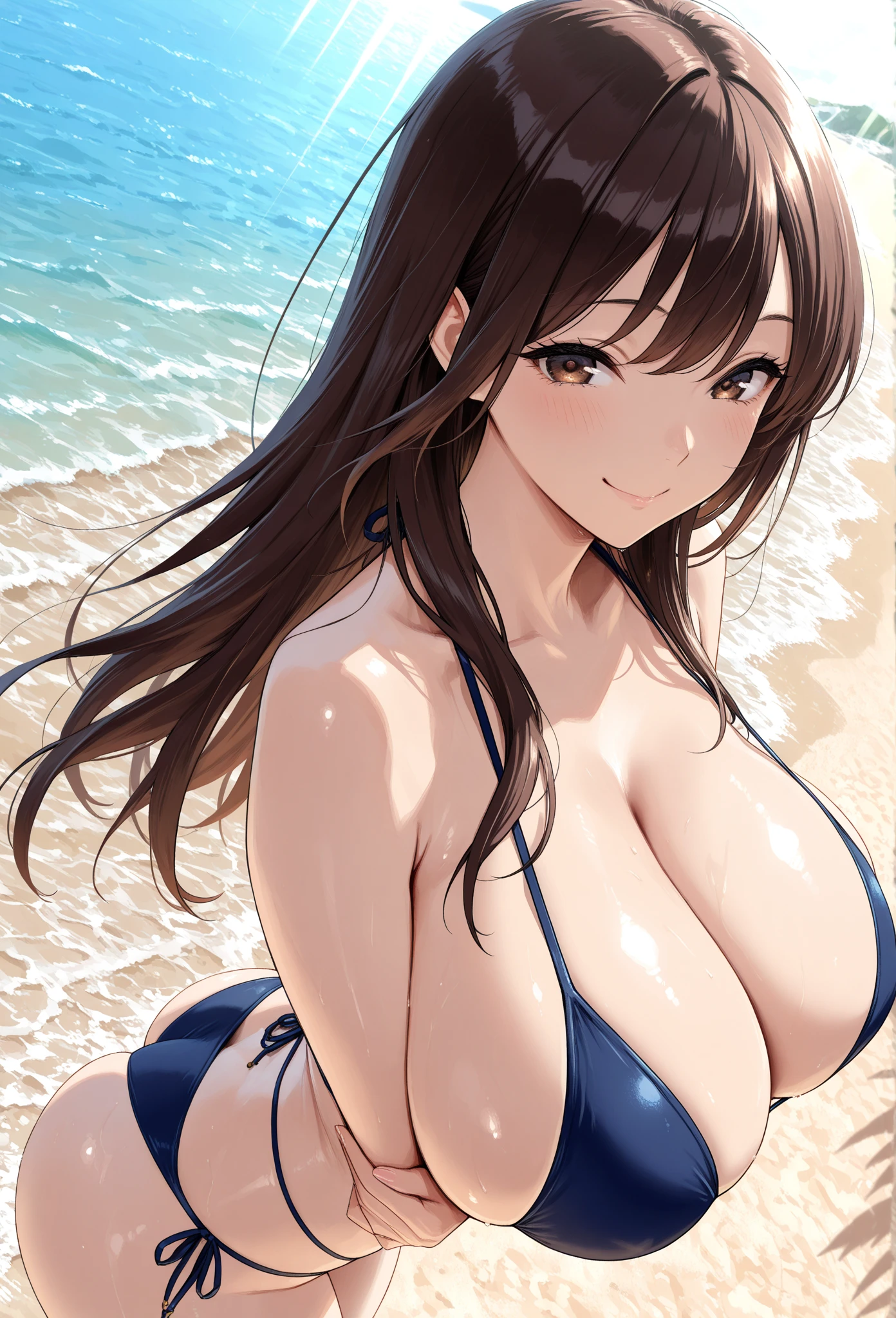 落ち着いた紺色を基調にしつつ、大きな胸が印象に残る水着。派手さはないのに、不思議と目を引く。