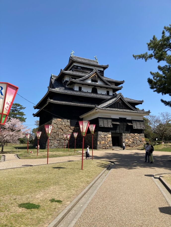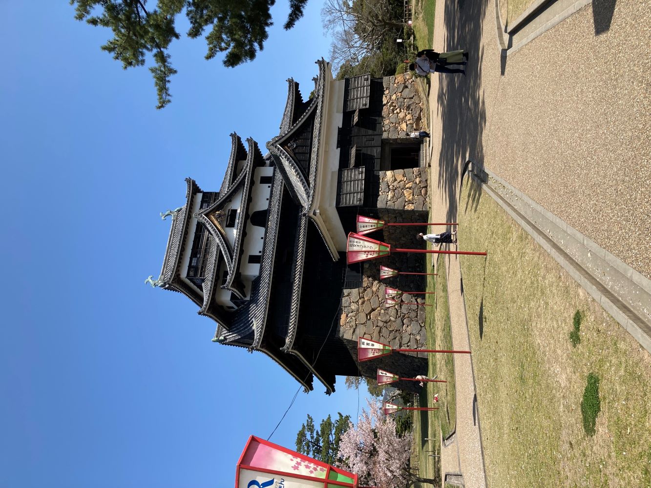 天守へと続く道沿いには、季節の桜まつりのぼんぼりが立ち並ぶ。場内に植えられる桜並木は満開の桜の枝先を、温い微風にそよりとなびかせていた。