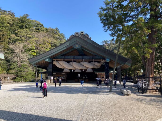 有名な出雲大社の大注連縄は、神楽殿に飾られているもので、長さ13.6m、重さ5.2トン、胴回り最大8mという、日本最大級の大きさを誇る。