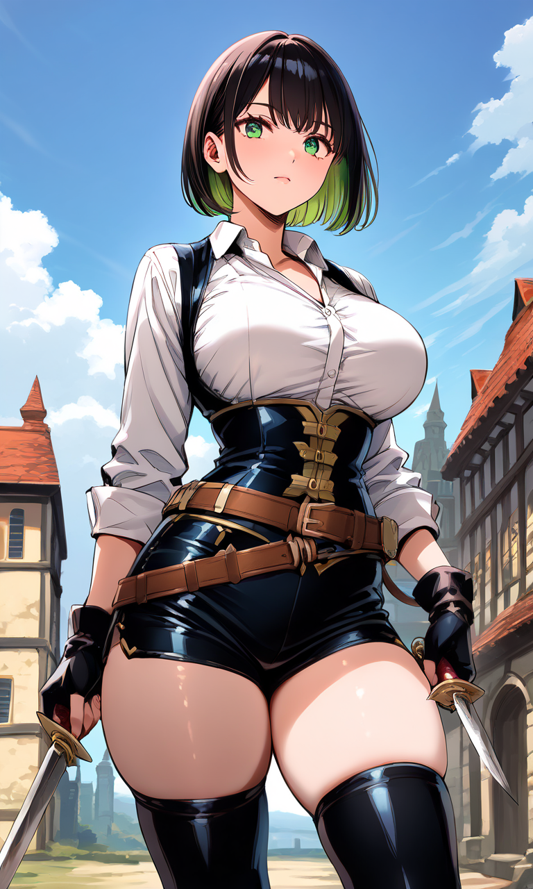 鮮やかな緑色のインナーカラーの入ったショートボブに、意志の強そうな勝気な瞳。装備は防御力よりも動きやすさと「映え」を重視した、露出の多いギャル風の冒険者スタイルだ。