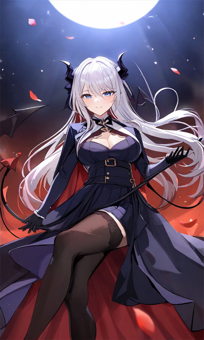 黒い角に、白い髪、青色の眼に胸元がよく見える黒い服と「フィッシュテールスカート」と呼ばれる前が短くて後ろが長い黒いスカートを履いており、薄茶色のソックスを履いている。