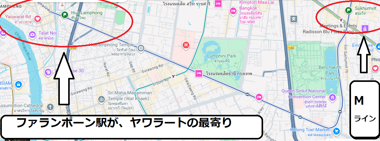 (M)ラインのスクンビット駅から、ファランポーン駅へ行けばよい。