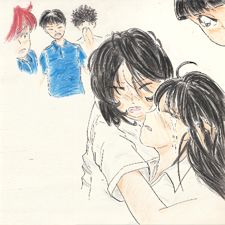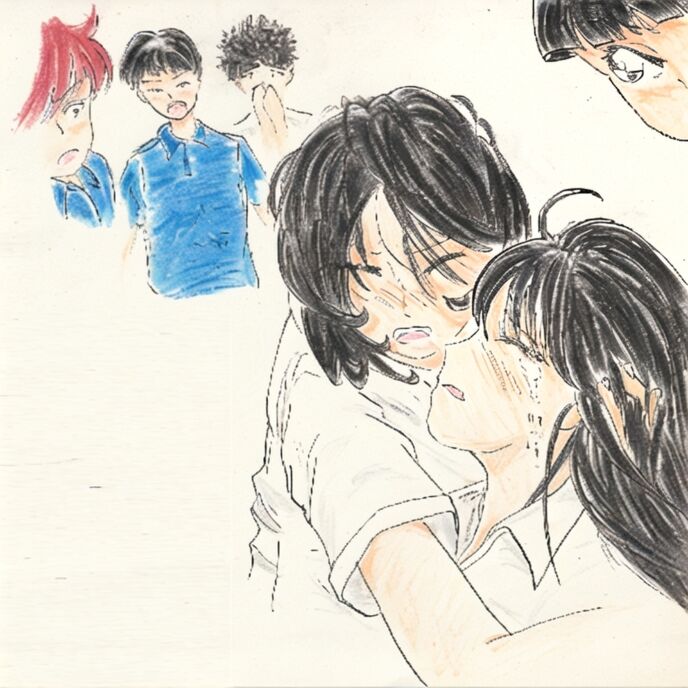 杏奈の声だけが響く室内で、胸に飛び込もうとした眼前の女子の横を素通りした務が、奈緒の傍らに跪いて自分のポロシャツを脱ぐと、ゆでだこのように赤く染めた全身を震わせながら、奈緒の無残なワイシャツの上に被せた。その瞬間、この子の身が激しく強張って、硬い石のように変化した。それに気がついた彼は、むき出しにした歯が砕けるほどに噛みしめる。