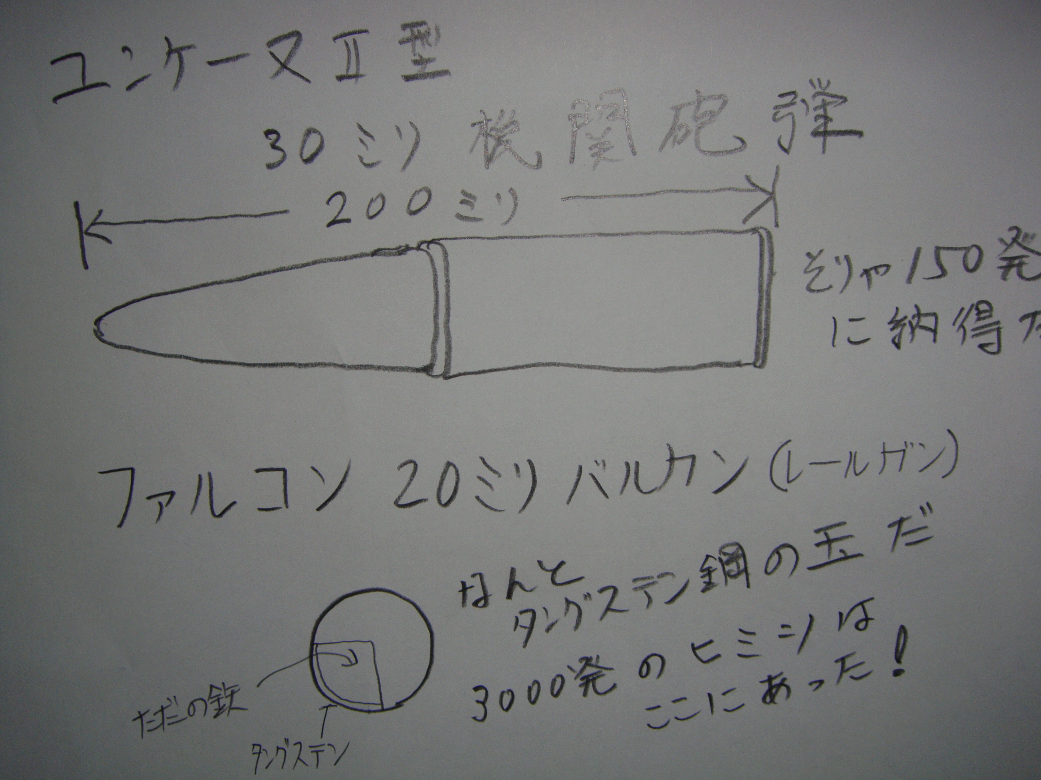 日本の空母の超伝導カタパルトの技術の応用がある。 つまり、レールガンである。 皆さんは、ファルコンの20ミリバルカンが装弾数3000発と聞いて、盛りだ、カケだ。 と笑った諸君も多々・・・・多いだろう。 しかしである、著者は、あえていう、3000発は盛りではないと。 著者は手から金粉もでないし、握手で相手の癌は治らないし、まして生まれてすぐにタライで立たなかった凡人である。 だが、ファルコンの3000発は盛りではないのである。 それは、レールガンである。 無重力の真空で合金を作り、初めて完成した超伝導コイルを応用したものである。 それで、薬莢がいらないのだ。 ここに、ユダヤスパイから入手した独逸帝国のユンケーヌⅡ型の30ミリ機関砲弾と、我がファルコン20ミリバルカンの弾のメモを示そう。 これは、へたくそであるが、素人であるから勘弁して欲しい。 これで、3000発がご理解いただけたと思う。 なお超伝導コイルは日本国最大の軍事機密であり、著者には全く外観もわからないのである。 なんと我らがアベ、イヤ山田総理も見たことは無いのである。 米国のファルコンも英国のファルコンもバルカンはブラックボックスであり、分解すると爆発して機密保持するのである。 なお注意書が書いてある。 分解する貴殿の命の保障は無い。 独逸帝国のユンケーヌ社は馬力のでないエンジンを2個串型にして馬力を得た。 それで、ファルコンに対抗できる速度を得た。 そして、射出座席だが、これには日本のロケット技術が裏にある。 なんと、固形燃料ロケットで座席を射出するのだ。 独逸帝国が火薬やバネで出来ない秘密がここである。 火薬が多いと操縦者が爆死だ。 すくないと後部プロペラでミンチだ。 君は爆死かミンチか、どちらがいいかな。 著者は両方、ゴメンである。 それで、ユンケーヌ社の技師は、あいまいなところで、火薬の量をかげんしたのだ。 まあ賭けである。 数センチでプロペラから逃れるかもしれない。 まあ、そんな装置だが、ないよりはマシだ。 ファルコンは3連セラミックターボで、2000馬力越えのエンジンで、ユンケーヌⅡ型は串型双発で2000馬力をひねり出したのである。 独逸帝国の英国進攻は新総帥就任記念も兼ねて、独逸帝国の威信をかけて準備されていた。 それは、上空300キロの偵察衛星から逐一、画像が送られてきたからわかるのである。 100機のギガント輸送機は、はぼ数が揃ってきた。 空挺隊員は無双の陸軍精鋭でそろえた。 さあ、あとはユンケーヌだ。 ところが、それが、なんとも、数がなかなか揃わないのである。 日産(クルマではない。)1機くらいなのだ。 あまりに先進的な戦闘機はテストで脱落する機体が多く、最終試験にパスしないのである。 ユンケーヌ工場の裏には、試験で落ちた機体のゴミが山と積まれていた。 たまに廃品業者がタタイテて安くクズアルミとして買ってくらしいが。 「おい、ヤバイ、こんど新総帥が見学に・・・・」 「え、どうする、逐電するか、シベリアよりは・・・・・」 ユンケーヌの幹部は真っ青だ。 ・・・・・・・・・