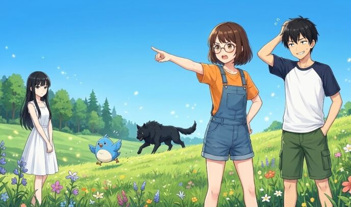 その姿にどこかで見た覚えがあり、チハルとマリンが目を凝らしてその様子を眺めていると、青い鳥のすぐ背後――草原の影を切り裂くように、黒い何かが地を蹴って迫ってきた。