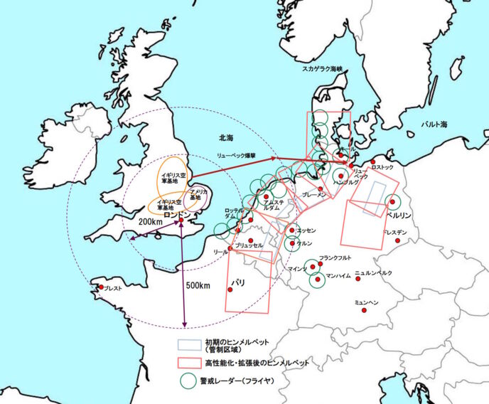 初期で示された灰色の四角のドイツのヒンメルベットの配備はほぼ史実に近くなっています。但し、史実の管制区域はもっと多数に分割されていました。