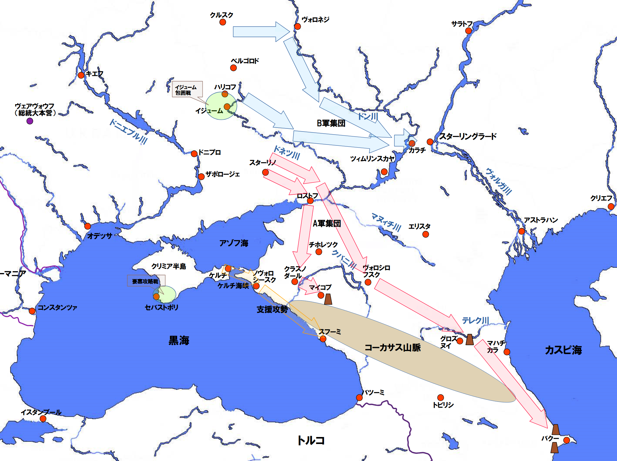 地図を見てわかるように、ブラウ作戦の対象となる地域は非常に広い範囲です。例えばハリコフからバクー油田までは1500kmもの距離があります。これはハリコフからウィーンまでの距離とほぼ同じです。