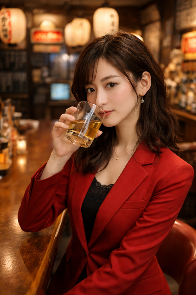 二人は二件目のバーで飲み直し、そこで赤いスーツをまとった謎の女性と出会う。