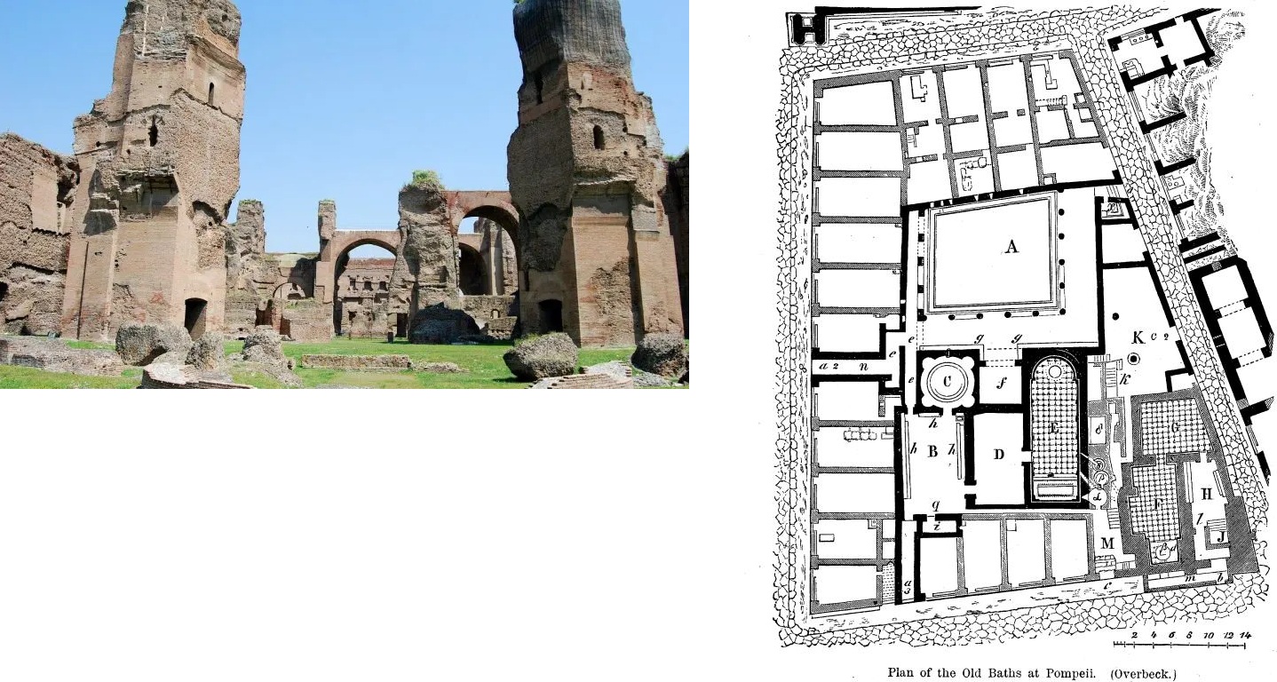 古代ローマの「公衆浴場」は、共和政期と帝政期では若干の違いはあるが首都ローマだけでなく地方都市にもひとつはあり、それぞれ高温浴室と微温浴室、冷浴室を基本として、所によって蒸気風呂や乾燥高温室なども備えていた。