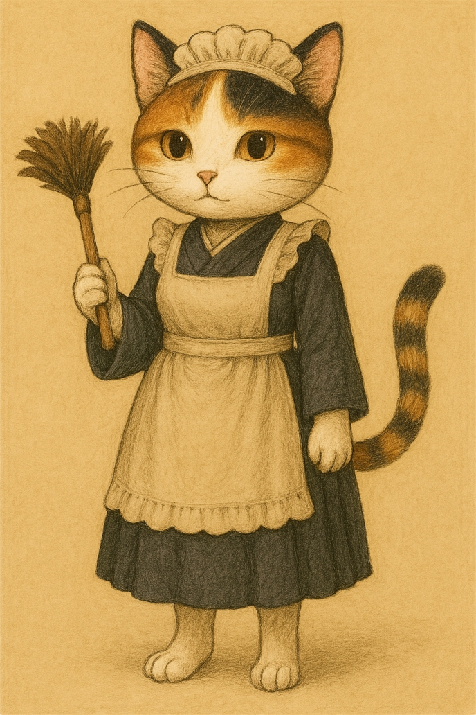 よくある猫獣人の語尾は「にゃん」説は否定されたけど、濃いグレーの和風な給仕服に白いメイドエプロン、そしてメイドカチューシャをつけた三毛猫にゃんは、私のハートをクリティカルヒットですよ!