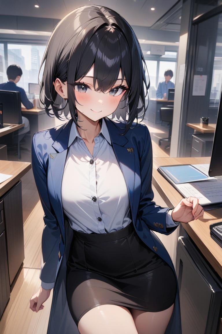 今日の服装は、水色のワイシャツに紺色のジャケット、タイトスカート。
