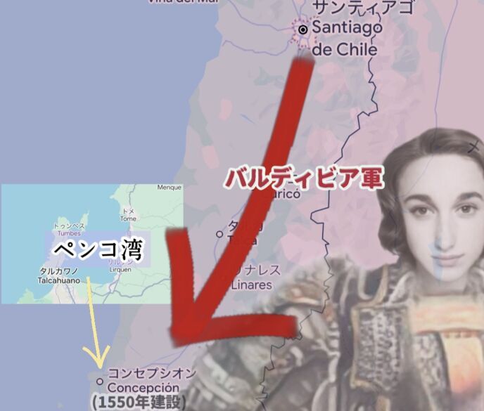 マルコス「バルディビア様は緯度の高い場所に都市を建設したいらしくて、ペンコ湾が理想的と判断し、今そこへ向かってるんだ。」