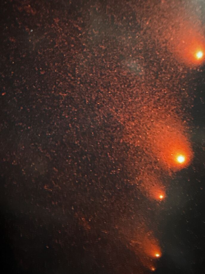 西暦2010年1月6日に発見された天体は当初彗星であると考えられていましたが、1月25日、29日にハップル宇宙望遠鏡で観測した結果、X字型の奇妙な構造を持つことが判明しました。小惑星同士の衝突の残骸であると考えられています。光点は衝突した小惑星の少し大きな破片で尾は衝突によって生じた無数の微笑な破片でできていると考えられています。