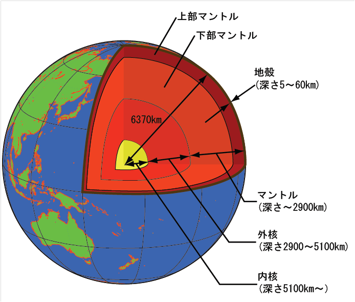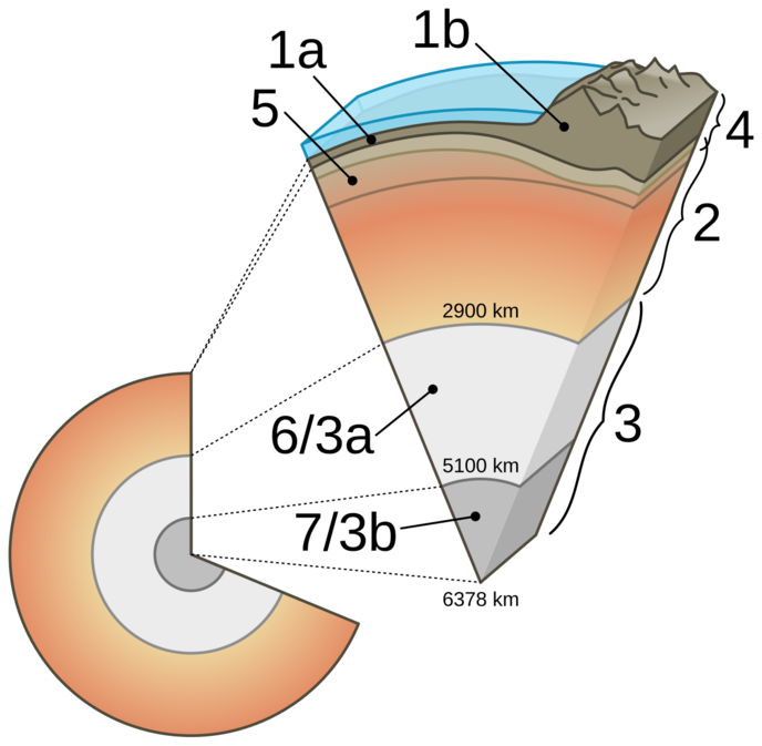 【1.地殻(1a.海洋地殻、1b.大陸地殻)、2.マントル、3a(6).外核、3b(7).内核