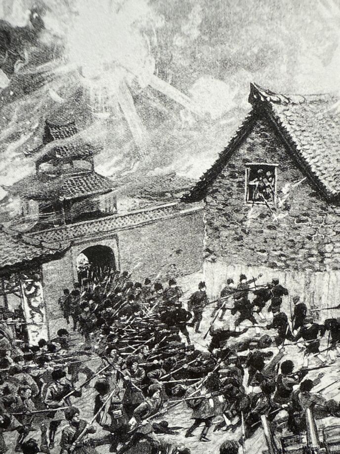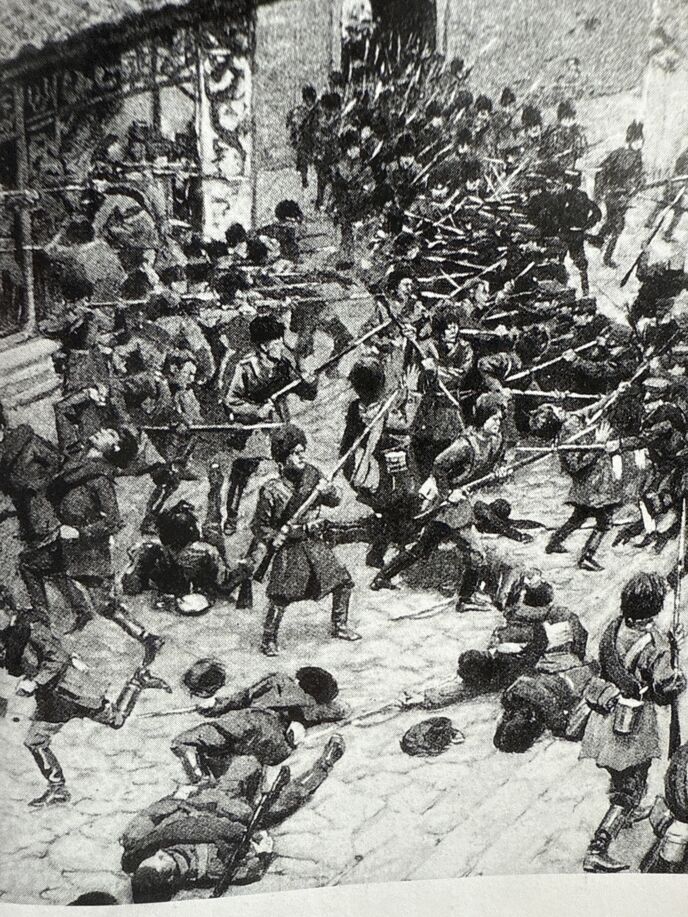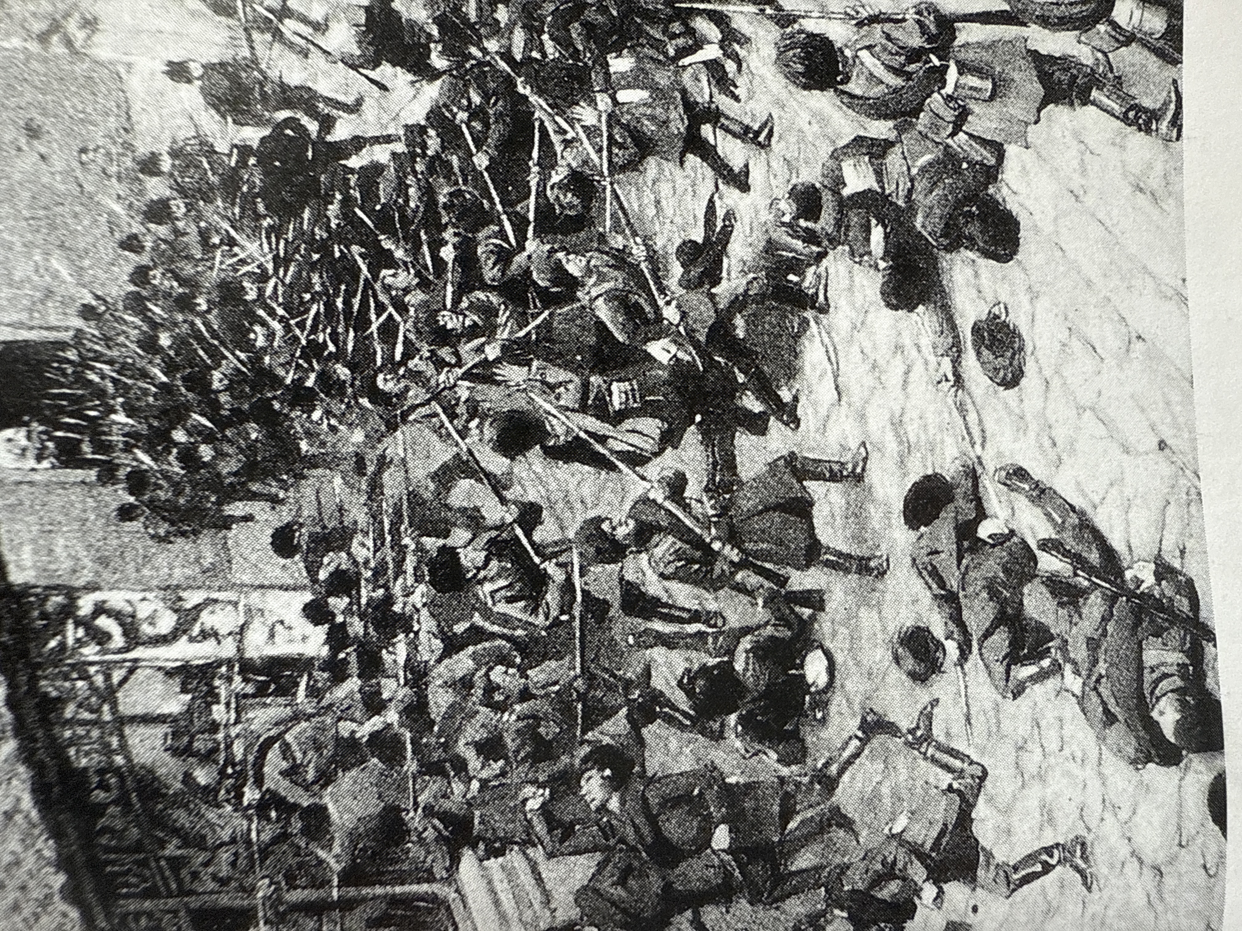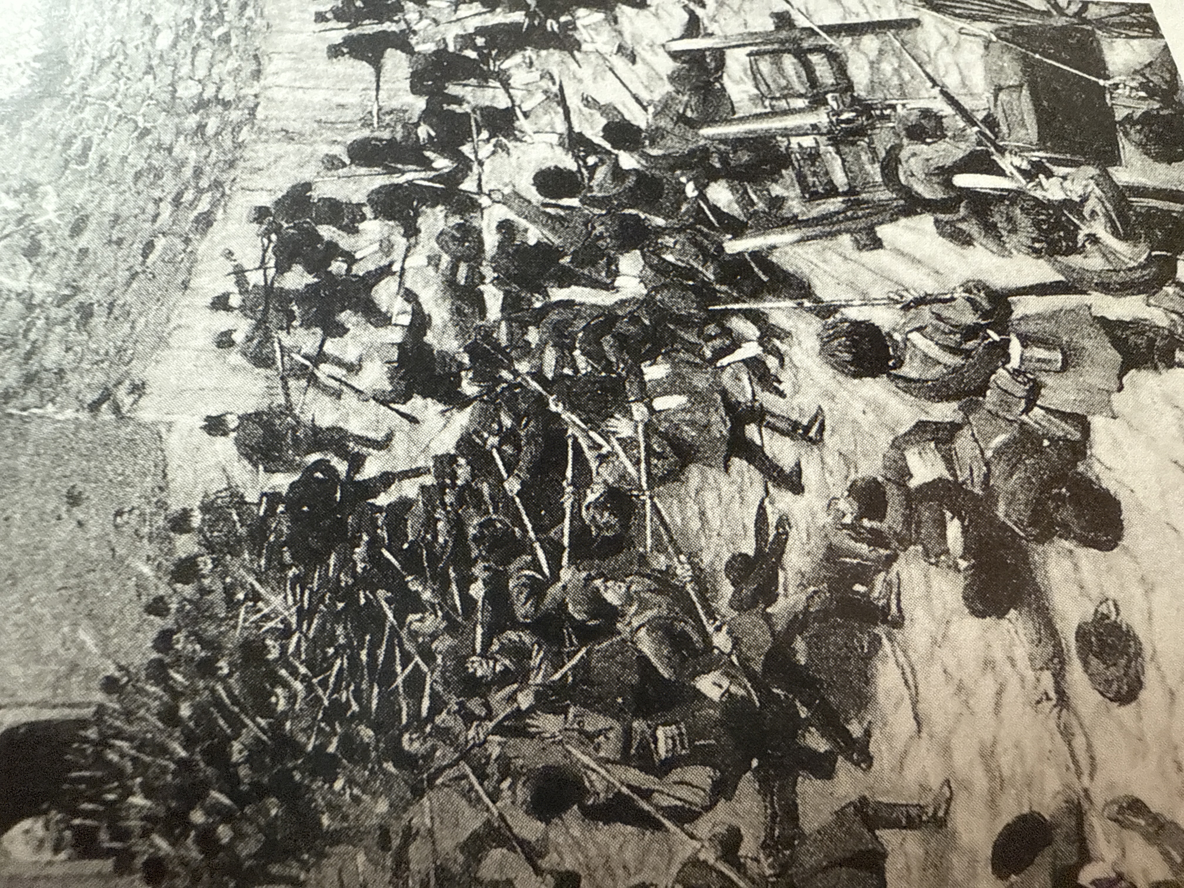この「絵」は外国人が描いた「金州城の戦い。」城内に突入した日本軍とロシア軍の白兵戦の模様が描かれている。
