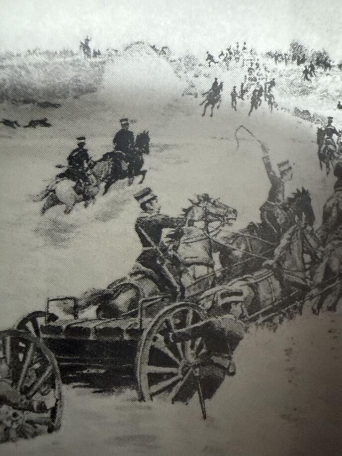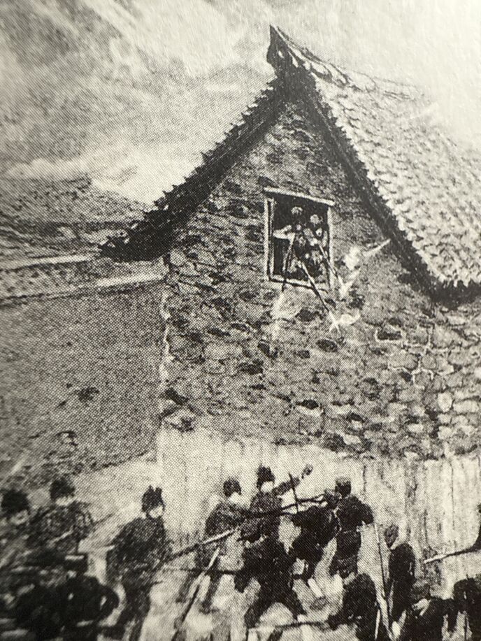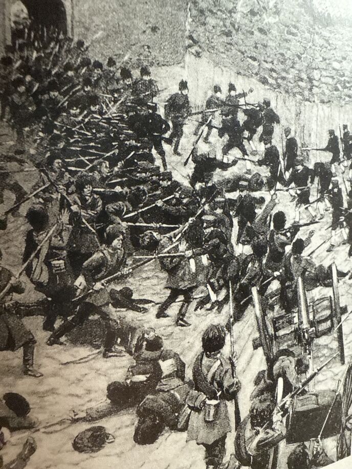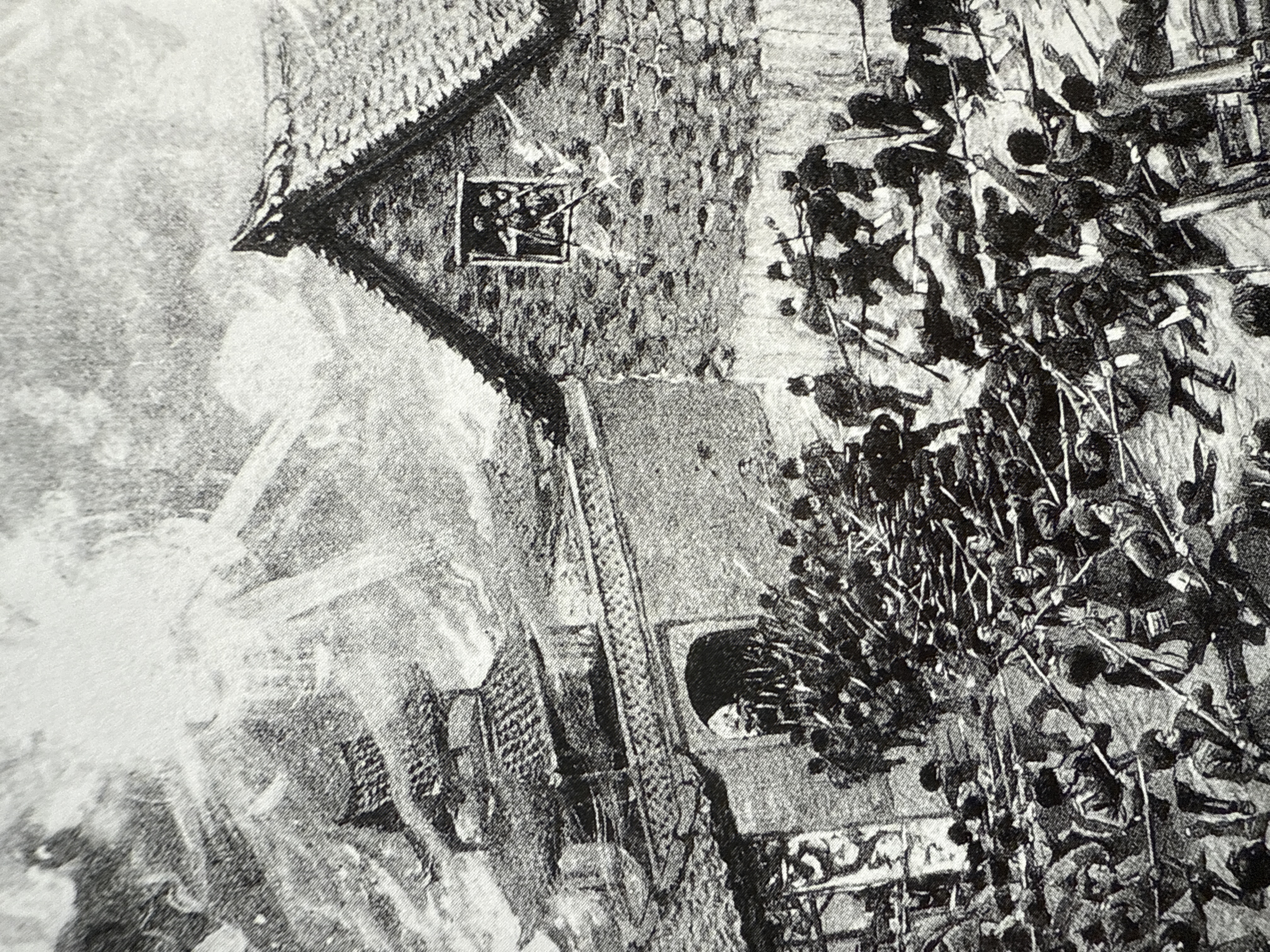 この「絵」は外国人が描いた「金州城の戦い。」城内に突入した日本軍とロシア軍の白兵戦の模様が描かれている。