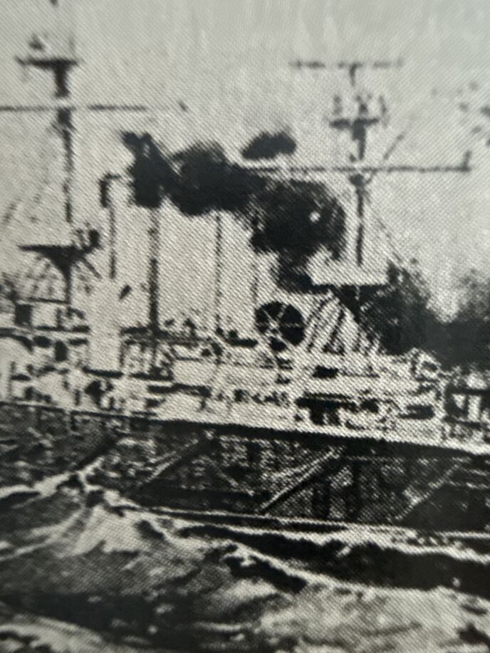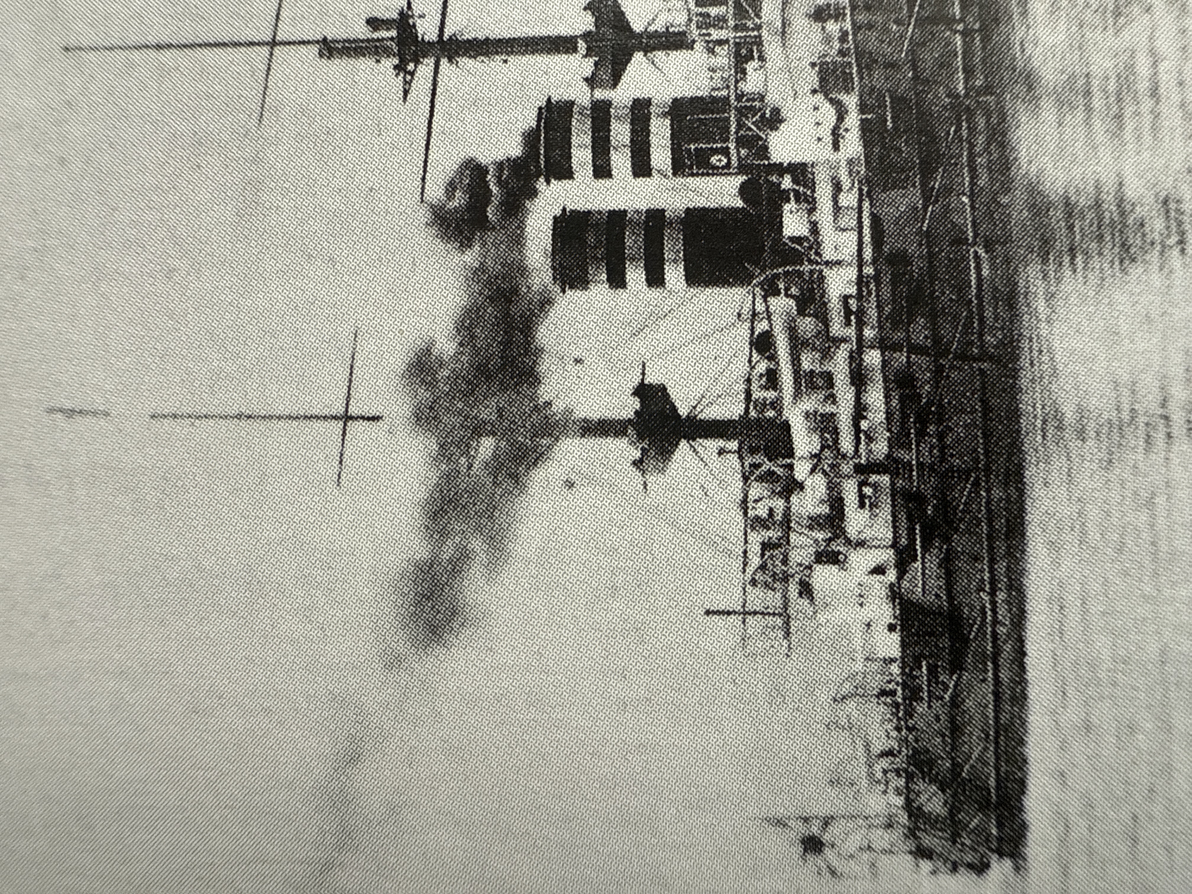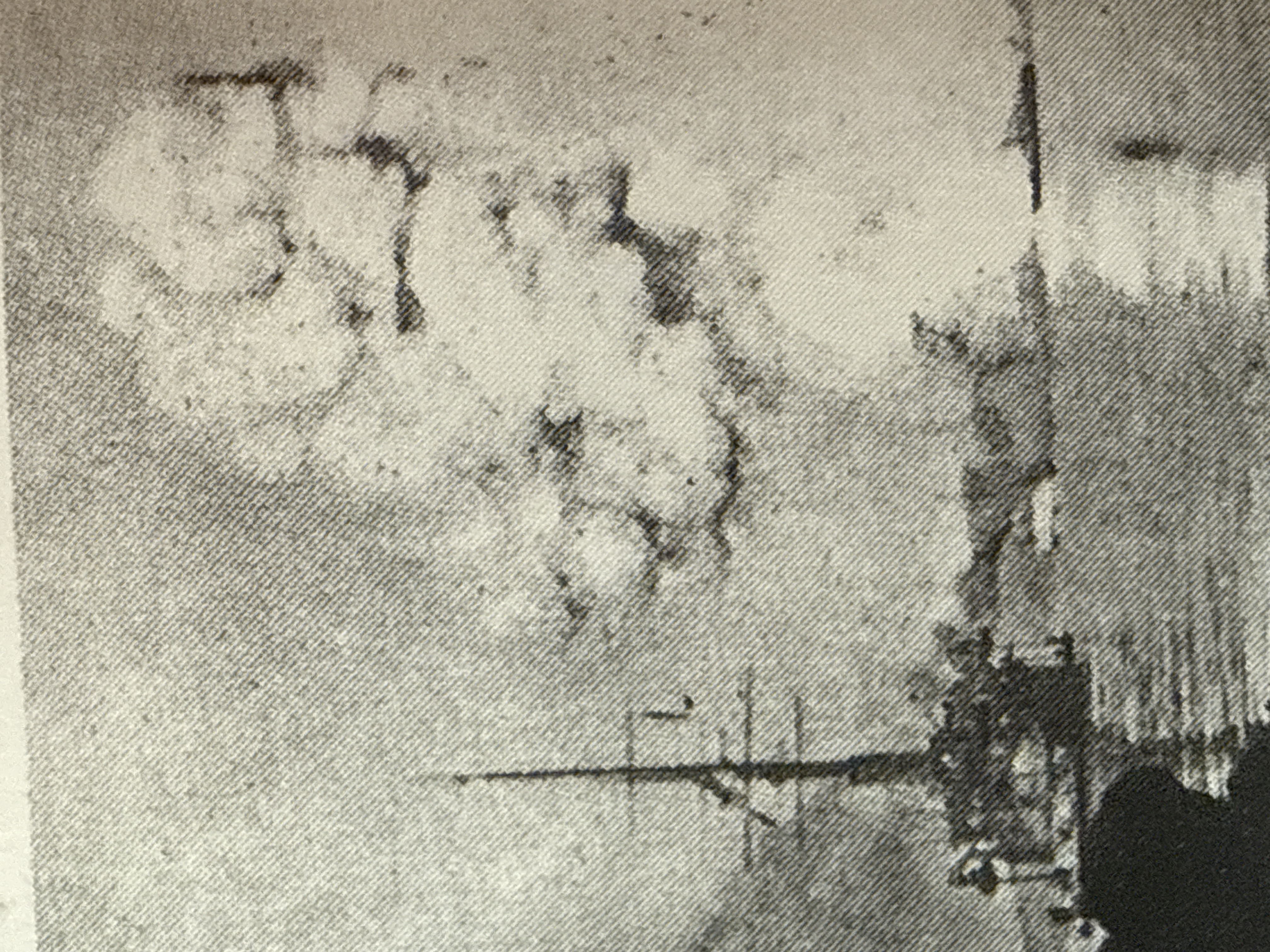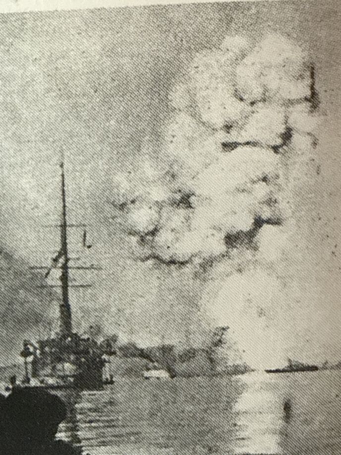 バルチック艦隊「コレーツ」は被弾し大爆発を起こして、沈没した。