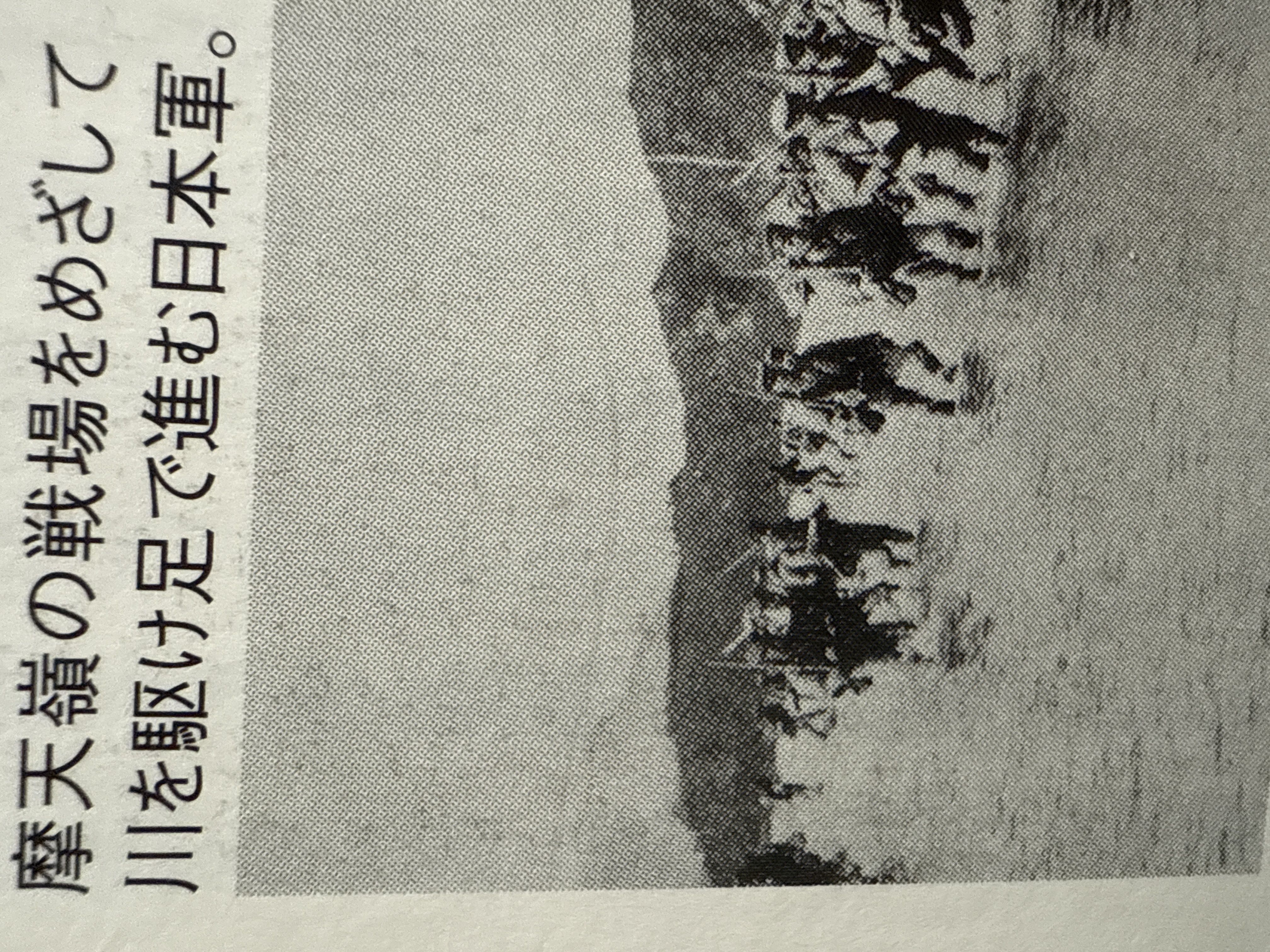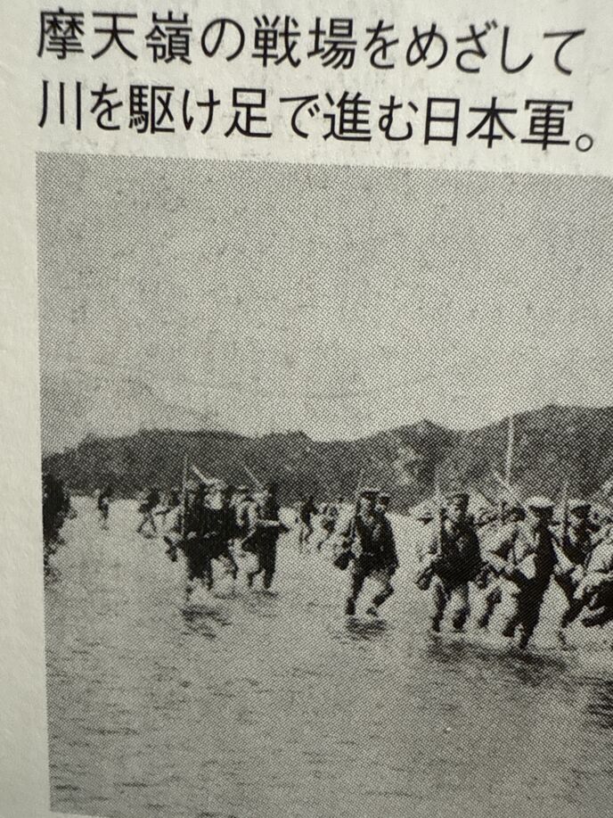 摩天嶺の戦場を目指して川を駆け足で進む日本軍。