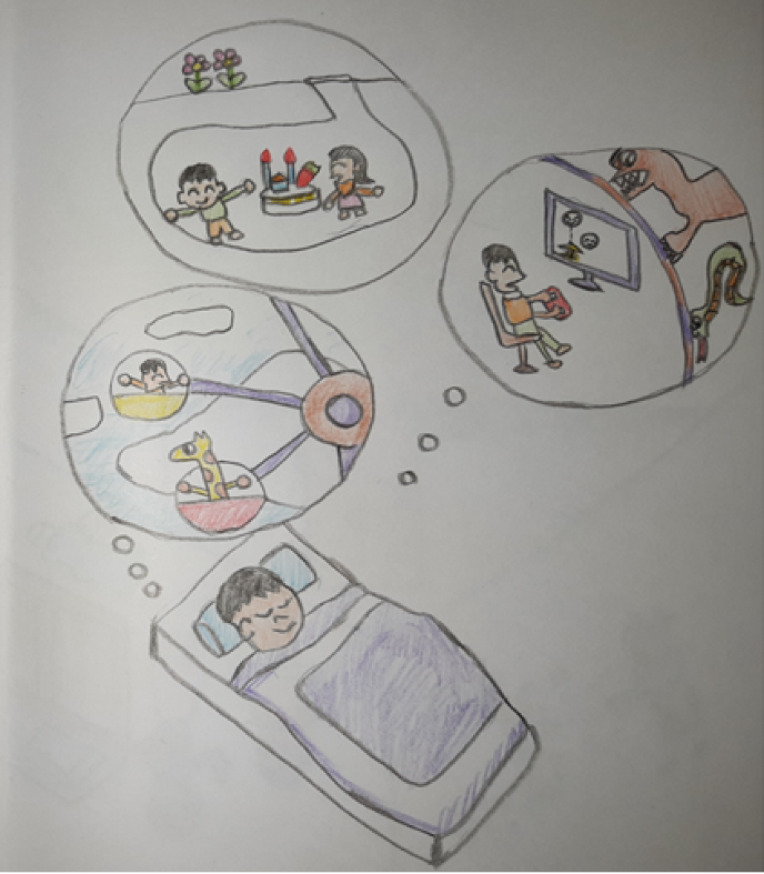 けんたは、ねるまえに、ふとんで、ゆめのせかいを、そうぞうしました。