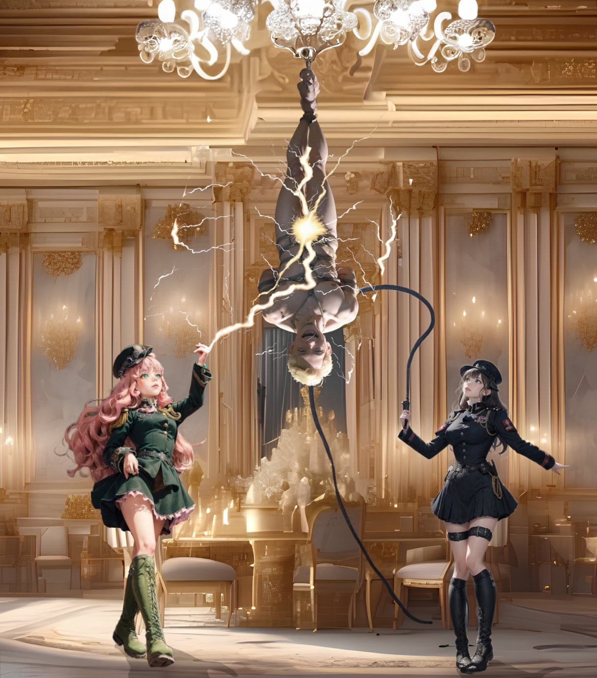 お仕置きで大広間のシャンデリアに逆さ吊りにして差し上げましたの。