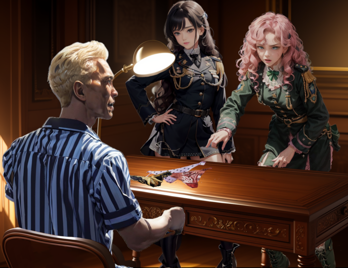 裸電球スタンド風の照明をカルアンの顔に向けてルルナが問い詰めましたの。