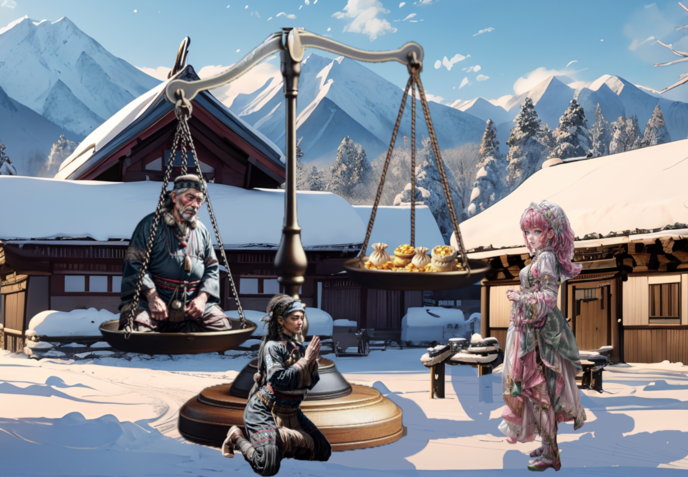 畏まる村長の頭に肩に、降り始めた雪が積もる。