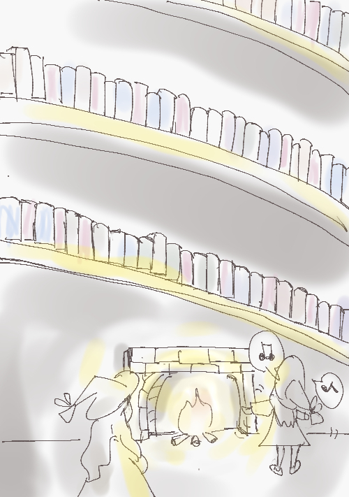 リプルたちが立っている場所は、教室くらいの広さ。正面に火が燃えている暖炉があって、一人用のテーブルとイスが置いてある。テーブルとイス以外は、すべて本だった。