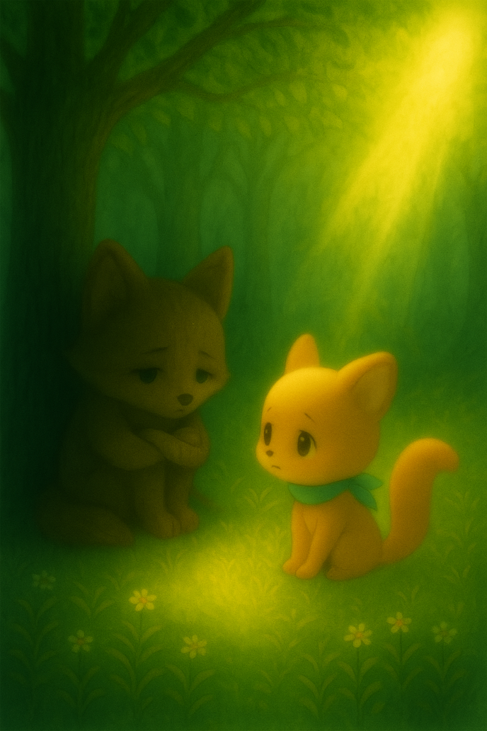 しおりを挟むその ひろば の すみ で、ひとり で しずか に すわる キツネ に であう。