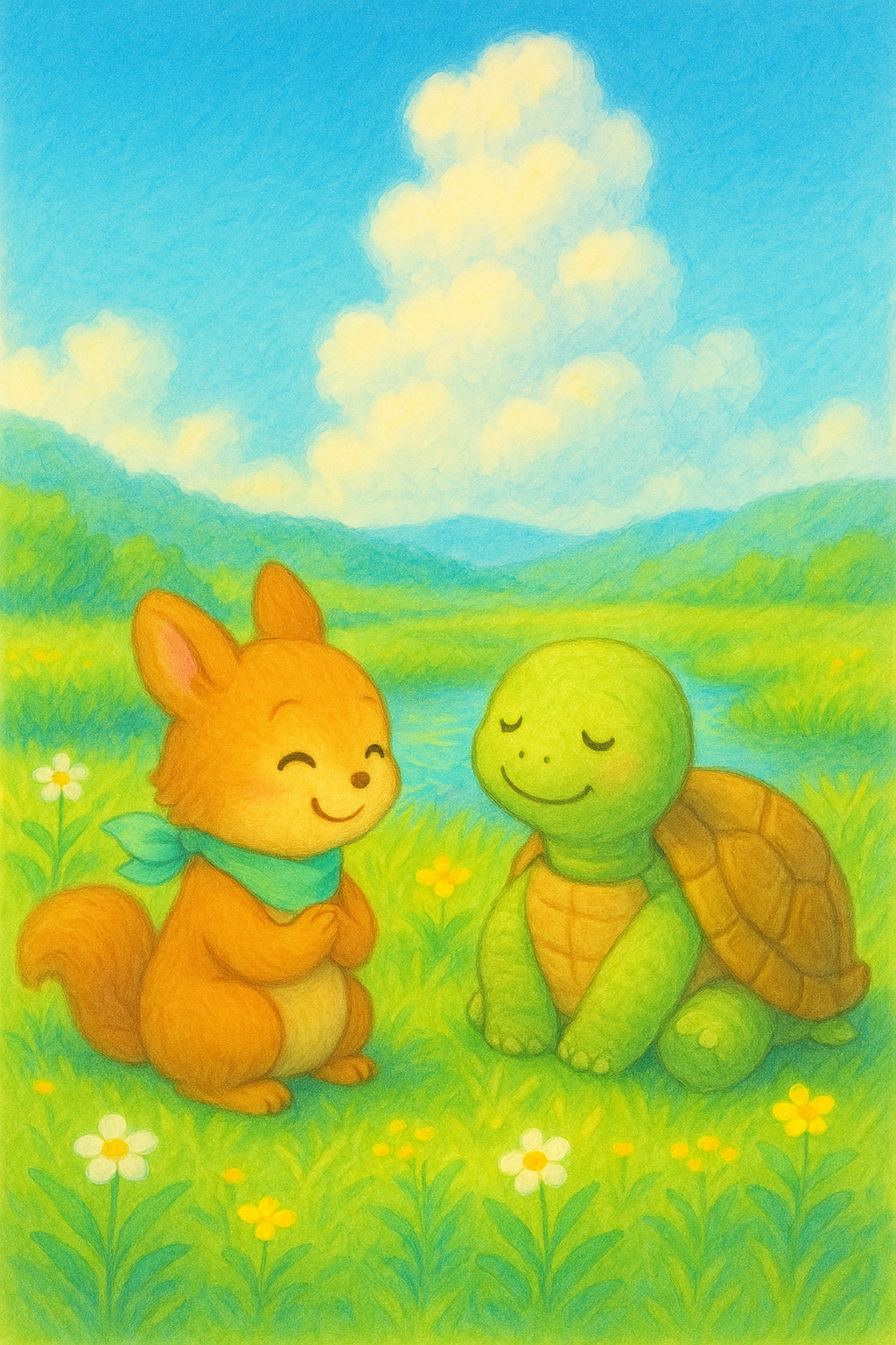 「……ボク は、カメタ。この そうげん を みまもってるんだ。かぜ の おと を ききながら、コトバ を かんがえる の が すき なんだ」