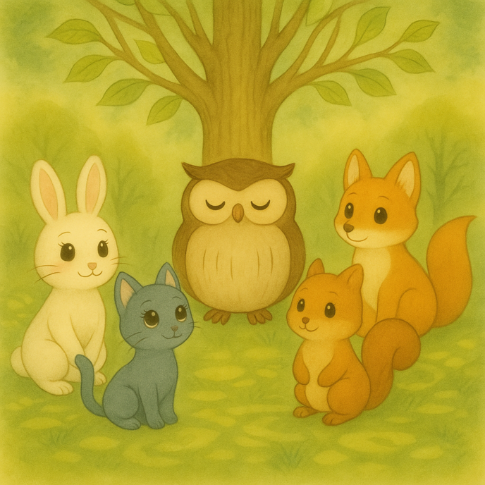 きの まえには、もりの さいばんかん、フクロウの ホウホウが しずかに たっていました。