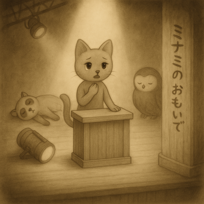 しょうめいが おちて、きょうえんしゃが たおれた とき、ミナミは しょうげんだいに たちました。
