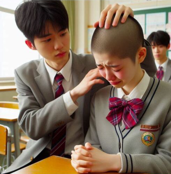学校の門を潜る瞬間、美咲の心臓は重い鉛のように沈んでいた。門をくぐると、周囲のざわめきが彼女の耳に届く。一歩一歩、彼女は自分の足音と共に教室へ向かった。彼女の坊主頭が生徒たちの間でささやかれる音が、耳障りに感じられた。自分の席に着くと、彼女はもはや堪えきれず、頬を伝う涙を静かに拭った。