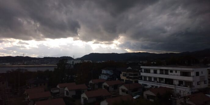 詞書:今日一日空が大きな黒雲で覆われていた。もう12月、今年も終る。貧老故就労を求め続けたがならず、執筆も(ストーカーどものせいで)捗らない。魔の嘲笑のような空…しかしこのまま負けていいだろうか?下記のマドンナのPV(プロモーションビデオ)内のごとく、魔に責められても、苛められても頑張ろう!!