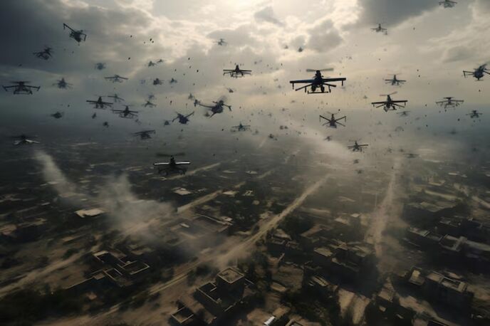 詞書:これは地獄の黙示録の21世紀版だ。お目見え当初はこんな便利で、人の役に立つものはないと思ったが今や無人殺傷兵器の主役と化した。カメラ搭載のドローンなどその殺戮現場を写しさえしている。ウクライナやガザにおけるそのビデオを我々は今はSNSで他人事として見ているが、近未来このドローン・ワルキューレが我々の頭上に現れることは確実かも知れない(ドローン大国・中国が隣にある)。しかしまったく、ダイナマイト、原子力と、人はいつもこうだな。😣