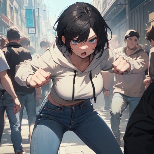 やくざたちは女3人が刺客と知らず、完全に不意打ちを食った。太田の右に着いた男の正面から顔面に稀世のドロップキックが決まり、5メートル吹っ飛ばした。続いて太田の左わきを抱えた男には延髄切りをかまし、崩れ落ちたところ顔面に渾身の膝蹴りを叩き込んだ。「ゴリッ」っと鼻の骨が折れる鈍い音が響いた。その前後では直と粋華が華麗な合気術の連舞で次々とやくざを放り投げている