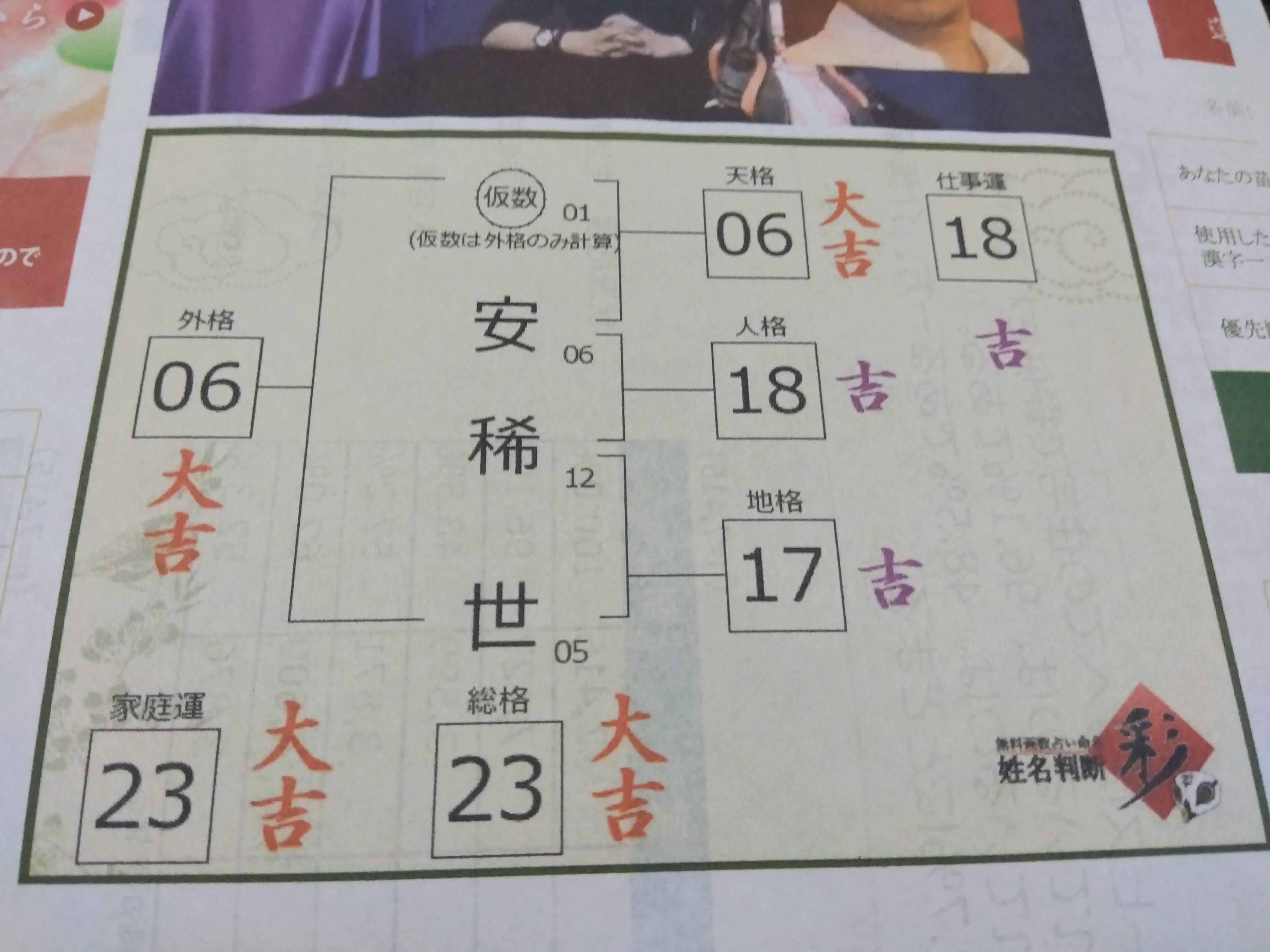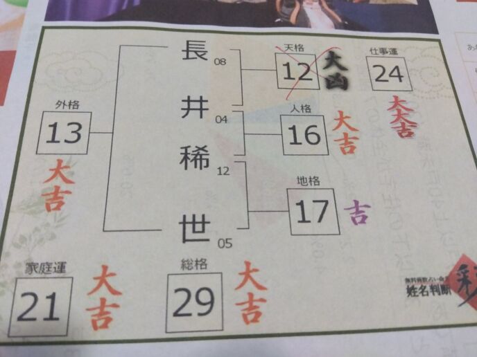 ちなみに「結婚後」の「長井稀世」は「長生きよ!」と言う洒落が入ってるんですけど「結婚後」男性の苗字を引き継ぎ女性は「天格」は関係ないので、それ以外は全部「吉」から「大大吉」になるよう「長居」、「永井」、「奈雅井」、「永冶」、「永居」、「長伊」等も試したことが思い出されます!