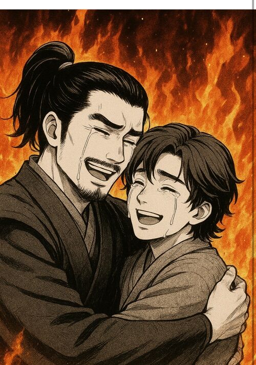 彼女の父は、巻物を抱いたまま炎に消えた。