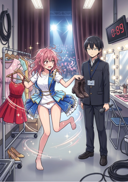 「手段は選ぶな、とにかく脱がせて、着せろ」――。 華やかなステージの裏側、一分半の着替え時間という名の戦場で、俺は現役アイドルの「お世話係」をすることになった。 次々と飛び込んでくる、ほぼ全裸の少女たち。だが、俺には一ミリの動揺もない。なぜなら、家ではパンツ一丁の妹を毎朝着替えさせ、ブラのホックまで留めさせられる「地獄」の日々を送っているからだ。 妹に鍛え上げられた鉄壁の賢者モードと神業の指先。事務的に汗を拭い、淡々と秘部を清める俺の「お世話」は、いつしか少女たちの心を、そして肉体を狂わせ始める……。 無機質な高校生が、無防備なアイドルたちを絶頂の先へと導く、禁断の裏方コメディ!